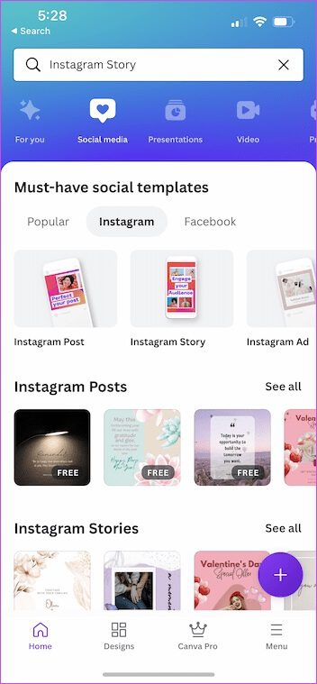 Canva هو تطبيق شائع لتحرير الرسومات. يقدم مزيجًا صحيًا من قوالب الصور المجمعة لقصص Instagram. أفضل جزء في هذا التطبيق هو أن معظم القوالب لا تتطلب رسومًا من المستخدم. في الوقت نفسه ، يحتوي التطبيق على واجهة مباشرة ، مما يسهل التنقل فيه.