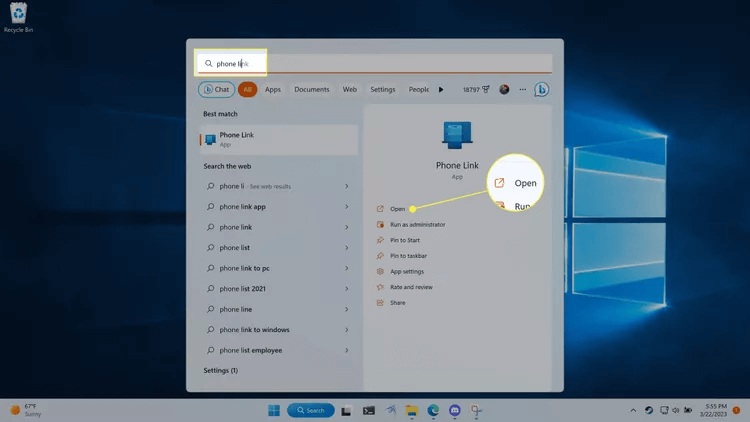 - انقر فوق مربع البحث في شريط المهام ، واكتب ارتباط الهاتف.