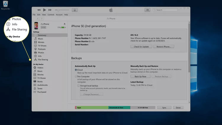 يمكنك أيضًا النقر على رمز الهاتف الموجود أسفل شريط القائمة بالقرب من الجزء العلوي من التطبيق للاطلاع على مزيد من المعلومات حول هاتفك. - يوفر قسم الملخص معلومات حول هاتفك ويسمح لك بعمل نسخة احتياطية لهاتفك على iCloud أو مباشرة إلى جهاز الكمبيوتر الذي يعمل بنظام Windows 11. لعرض الملفات ونقلها ، انقر فوق مشاركة الملفات.