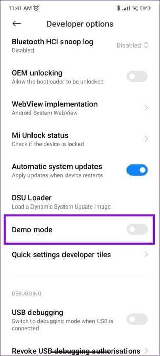 يعد Demo Mode أحد الخيارات الموجودة في وضع المطور في الهواتف الذكية التي تعمل بنظام Android. كما يوحي الاسم ، فإن الوضع التجريبي هو الشكل المختصر لوضع العرض التوضيحي الذي يمكن استخدامه بشكل أساسي لعرض إصدار تجريبي من الجهاز ، بغض النظر عن التغييرات التجميلية التي أجريتها.