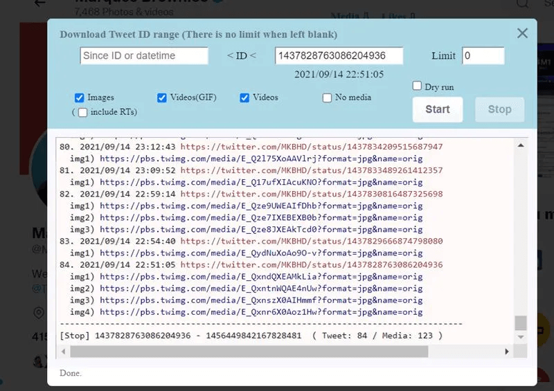 - أضف نطاق التغريدات وحدد نوع ملفات الوسائط التي تريد تنزيلها. انقر فوق “ابدأ”.