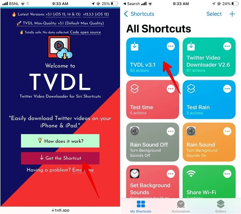 - قم بتثبيت اختصار Twitter video downloader من تطبيق TVDL. اضغط على “الحصول على اختصار”.
