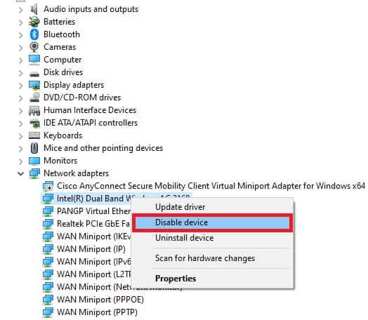 3. ثم ، انقر بزر الماوس الأيمن فوق برنامج تشغيل الشبكة (على سبيل المثال ، Intel (R) Dual Band Wireless-AC 3168) وحدد خيار تعطيل الجهاز كما هو موضح.