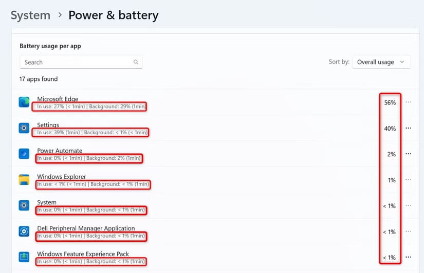 إذا كانت بطارية الكمبيوتر المحمول الذي يعمل بنظام التشغيل Windows 11 تنفد بسرعة كبيرة، فراجع التطبيقات التي تستهلك أكبر قدر من الطاقة. يمكنك مراجعة استخدام الطاقة السابق والحالي للتطبيقات المثبتة باستخدام الأدوات المضمنة فقط.