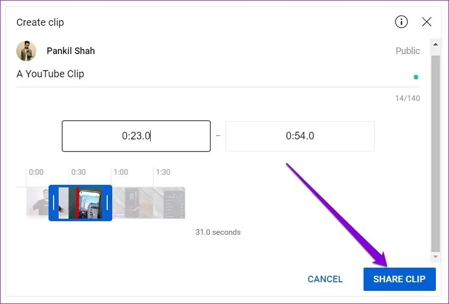 الخطوة 4: أخيرًا ، انقر فوق الزر Share Clip. يمكنك إما نسخ عنوان URL للمقطع أو مشاركته مباشرة على تطبيق من اختيارك.