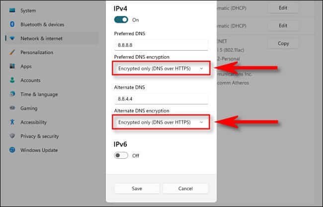 في نفس النافذة ، عيّن “تشفير DNS المفضل” و “تشفير DNS البديل” على “مشفر فقط (DNS عبر HTTPS)” باستخدام المربعات المنسدلة أسفل عناوين DNS التي أدخلتها في الخطوة الأخيرة.