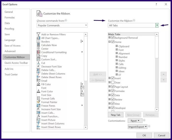 الخطوة 5: في أقصى يمين مربع حوار خيارات Excel وتحت الحقل المسمى تخصيص الشريط ، حدد القائمة المنسدلة.