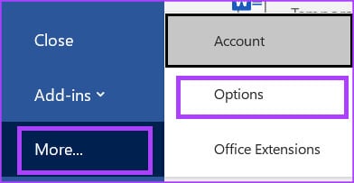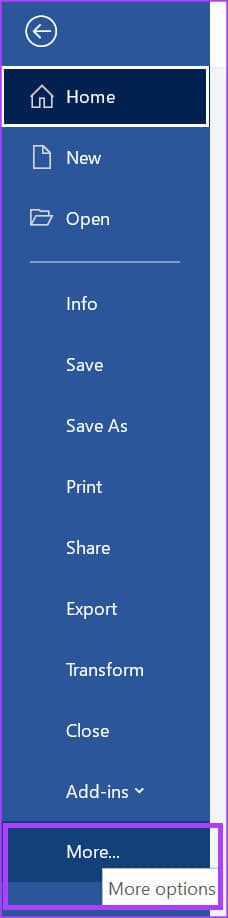 الخطوة 2: قم بالتمرير إلى أسفل قائمة “ملف” وانقر فوق “المزيد” أو “خيارات” للكشف عن قائمة مطوية.