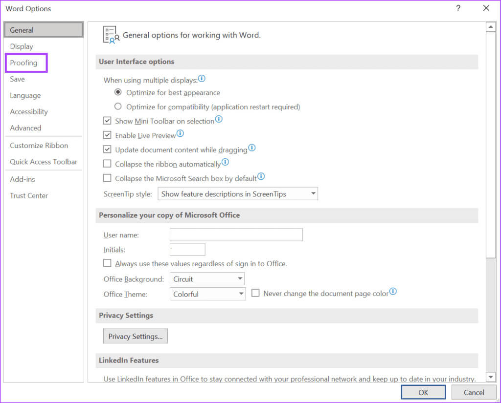 الخطوة 4: من نافذة Word Options المنبثقة، انقر فوق Proofing من الشريط الجانبي الأيسر.