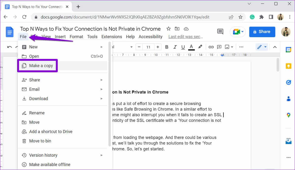 لا يسمح لك محرر مستندات Google بحذف إصدارات معينة من المستند. لذلك ، إذا كنت تبحث عن حذف محفوظات الإصدار لمستند محرر مستندات Google ، فسيلزمك عمل نسخة جديدة من المستند ثم حذف النسخة الأصلية. إليك كيف يمكنك القيام بذلك.