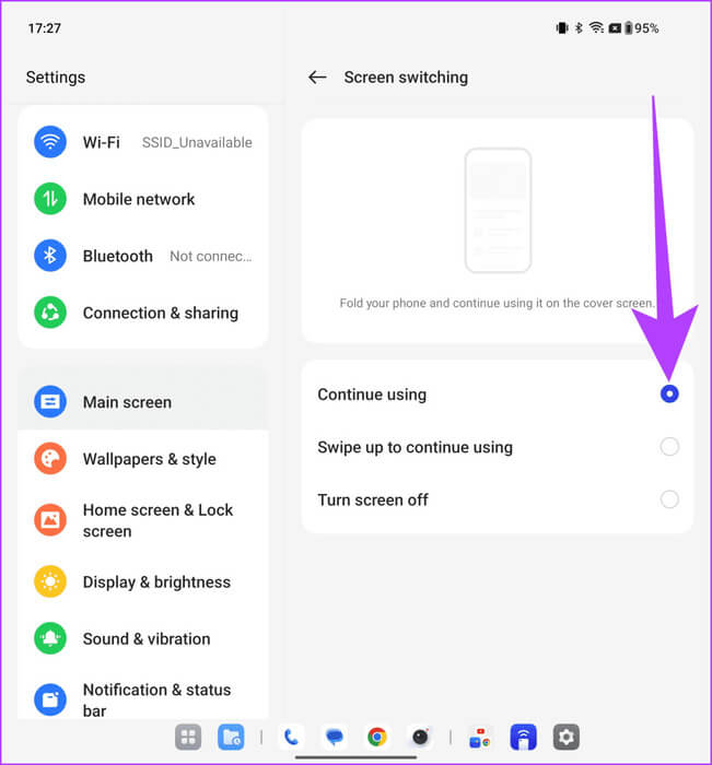 هنا، يمكنك اختيار ما إذا كنت ترغب في الاستمرار مباشرة في استخدام التطبيق على شاشة الغلاف أو التمرير لأعلى أولاً لمواصلة استخدامه. وبدلاً من ذلك، يمكنك اختيار إبقاء الشاشة مغلقة أيضًا.