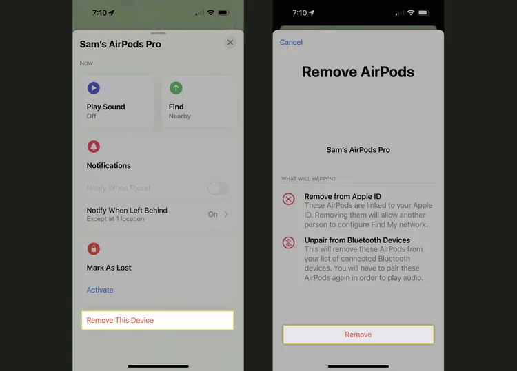 - بصفتك المالك السابق: في تطبيق Find My ، ادخل إلى نطاق الاقتران> انقر على AirPods> إزالة هذا الجهاز> إزالة.