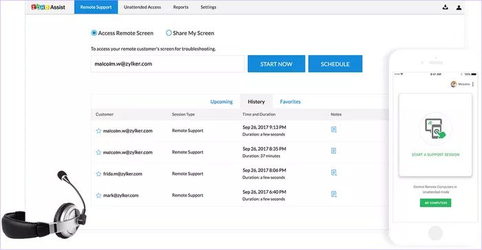 يتيح لك برنامج الوصول عن بُعد هذا دعم عملائك عن بُعد حتى أثناء التنقل. باستخدام Zoho Assist ، يمكنك تقديم الدعم عن بُعد لأجهزة الكمبيوتر من جهاز Android أو iOS والعكس صحيح.