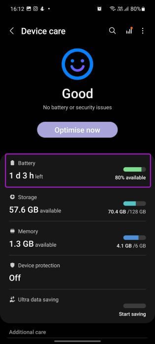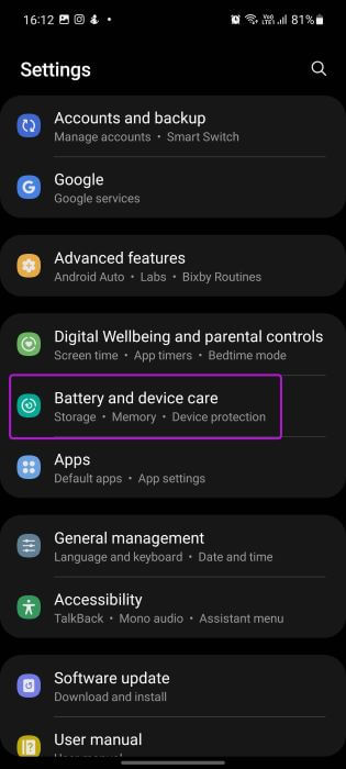 الخطوة 2: انتقل إلى قائمة العناية بالبطارية والجهاز.