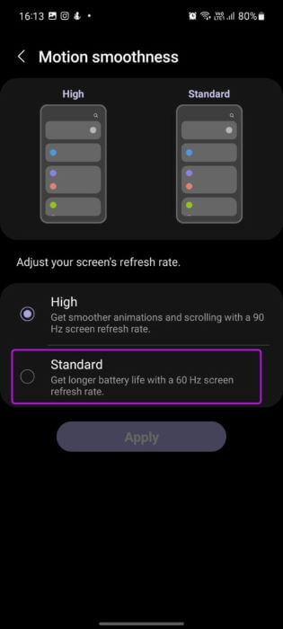 تتيح لك Samsung أيضًا تقليل معدل التحديث من 90 هرتز أو 120 هرتز إلى 60 هرتز القياسي للحصول على عمر أطول للبطارية. إذا كنت على ما يرام بالتضحية بسلاسة البرنامج وإحساس السوائل بالواجهة ، فيمكنك تغيير معدل تحديث الشاشة من قائمة الإعدادات.