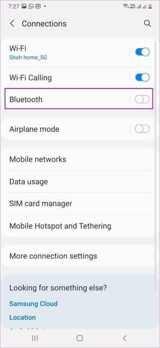 اسحب لأسفل من الأعلى وقم بتعطيل Bluetooth من قائمة التبديل السريع. بدلاً من ذلك ، يمكنك فتح الإعدادات والذهاب إلى قائمة الاتصالات. قم بإيقاف تشغيل تبديل Bluetooth ، وأنت على ما يرام.