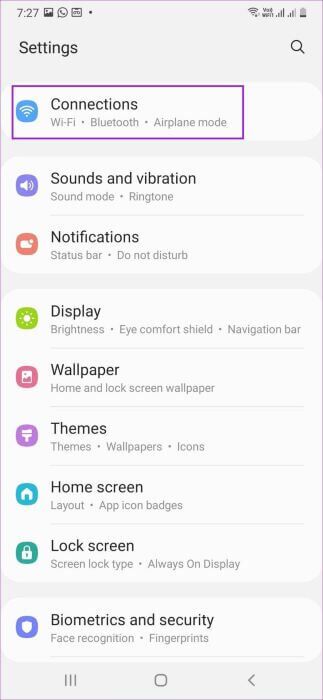 الخطوة 1: افتح تطبيق الإعدادات على جهاز Android (راجع الخطوات أعلاه). حدد اتصالات أو قائمة Bluetooth.