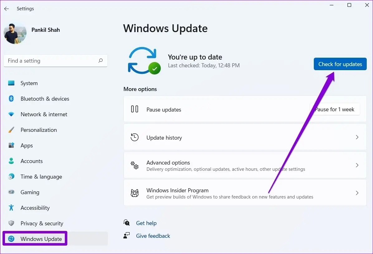 اضغط على مفتاح Windows + I لتشغيل تطبيق الإعدادات وانتقل إلى قسم Windows Update لتنزيل وتثبيت أي تحديثات معلقة.