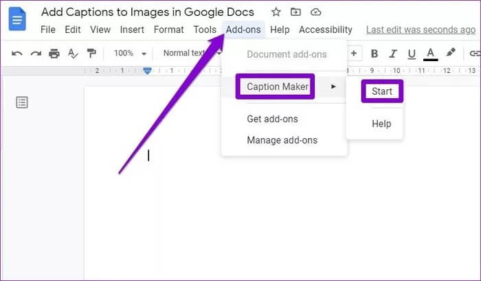 الخطوة 1: افتح مستند محرر مستندات Google الخاص بك وقم بتثبيت الوظيفة الإضافية Caption Maker.