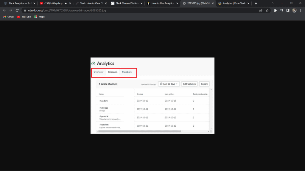 قم بالتبديل إلى علامة تبويب القناة لعرض تحليلات القناة. ستتمكن من عرض تاريخ إنشاء القناة وتاريخ آخر نشاط على القناة والعدد الإجمالي للرسائل المنشورة والعدد الإجمالي للأعضاء في القناة.